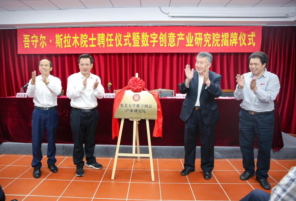 仪式上,沈灿煌和吾守尔•斯拉木院士共同为我校“数字创意产业发展研究院”揭牌。吾守尔•斯拉木院士为数字创意产业发展研究院的执行院长王强、王效杰,常务副院长陈万胜颁发聘书。