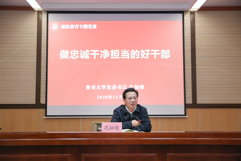 为落实全面从严治党要求,进一步加强党风廉政建设,增强党员干部廉洁从业意识和拒腐防变能力,11月10日上午,校党委书记沈灿煌在尚大楼103会议室为全校2019年以来新提任的科级以上干部上了题为《做忠诚干净担当的好干部》的廉政教育专题党课。