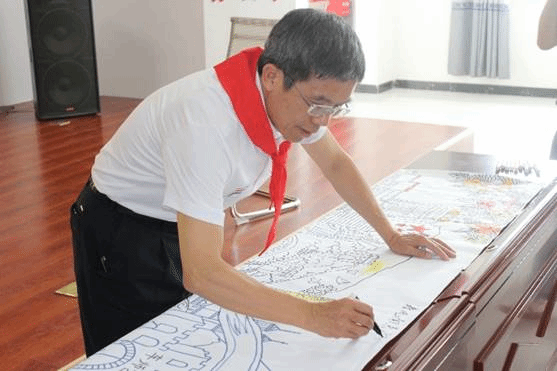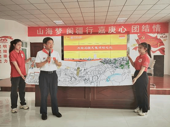 活动中,李清彪不仅与各民族同学互动交流,演示闽南泡茶工序、示范演唱闽南民谣,还与当地学生涂色共绘“中华一家亲”主题绘画作品,并为这幅山海梦画卷题词作诗。