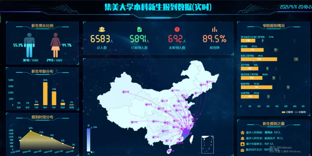 报到前,新生通过迎新系统进行预报到,完成实名认证和信息采集后,职能部门、学院和新生辅导员可以提前掌握学生的相关信息,科学安排迎新工作,精准帮扶家庭困难学生。报到时,学校在各报到点配备了人脸识别终端和身份证核验设备,首次实现将新生的现场报到照片、身份证照片和高考报名照片进行三合一比对核验,新生现场报到检录和身份核验同步完成。同时,全校迎新工作人员可以通过电脑或手机等移动终端实时查看新生报到数据和迎新动态,让科技为迎新工作赋能。