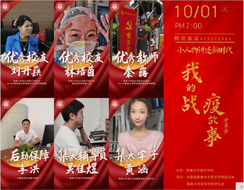 我校音乐学院87级校友、旅日闽籍侨胞刘丹蕻深情回忆了2020年疫情期间护送“钻石公主”号邮轮上的中国同胞回家的逆行故事,讲述同舟共济,守望相助的家国情怀;音乐学院09级校友、同安区第二实验小学音乐老师林培茵动情地和大家分享了参与同安区疫情防控志愿服务中的所见所闻,讲述责任与感动,大爱与大义;我校2021年学生最喜爱的优秀教师、音乐学院党员教师秦露结合抗战期间集美学校内迁大田,弦歌不辍坚持办学的故事,勉励青年学生直面困难,不负韶华;我校后勤集团龙苑餐厅经理李洪讲述了在封控管理期间学校后勤保障人员克服重重困难,舍小家为大家的战疫故事;舞蹈表演19级黄涵则分享了自己在集中隔离期间的点滴生活,讲述了拳拳爱国情和殷殷报国志;音乐学院辅导员吴佳煜讲述了在疫情防控期间高校政治辅导员“爱生如子”的炽热情怀和“爱国力行”的价值坚守。