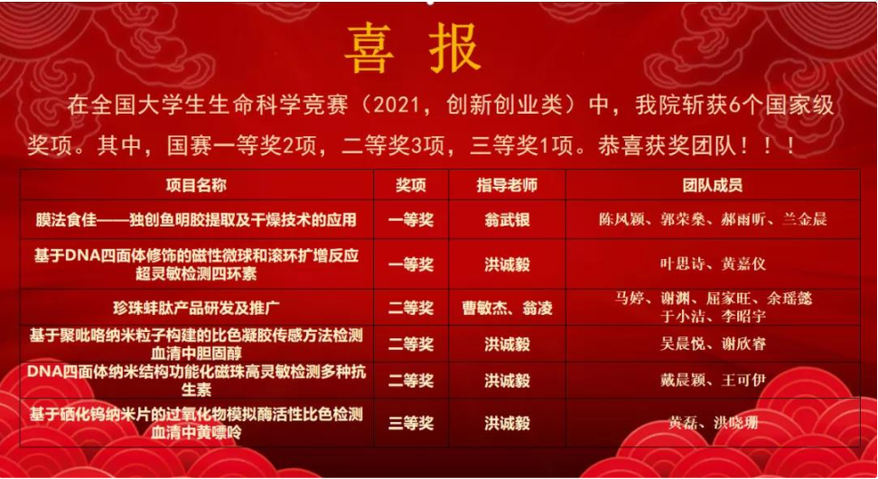 经过激烈角逐,海洋食品与生物工程学院学子共斩获6个奖项,其中国赛一等奖2项、二等奖3项、三等奖1项,这是老师悉心指导、同学们不懈努力的成果,充分展示了海洋食品与生物工程学院学子的综合素质与学院学科实力。