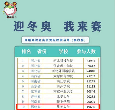 在冬奥会举办期间,共青团中央等单位组织开展“迎冬奥,我来赛”网络知识竞赛,我校获“迎冬奥,我来赛”网络知识竞赛优秀组织奖(高校榜)。