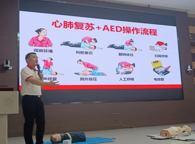 郭志辉结合一个个生活中的案例,深入浅出、寓教于乐,理论与实践相结合,重点开展了心肺复苏术、自动体外除颤仪操作使用、气道异物梗阻急救等救护理论知识讲解与实操演示。现场还结合互动问答、实际操作和AED模拟练习等方式,让师生员工学会了心肺复苏术、自动体外除颤仪基本步骤和操作方法,掌握了气道异物梗阻时正确使用海姆立克法急救等应急救护技能。