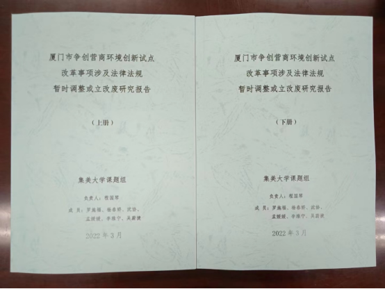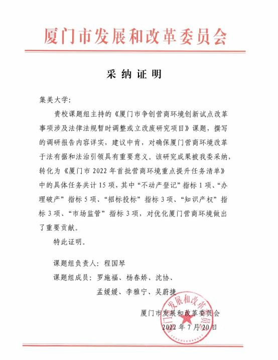 近日,我校海洋文化与法律学院副教授程国琴主持的课题《厦门市争创营商环境创新试点改革事项涉及法律法规暂时调整或立改废研究报告》的研究成果被厦门市发展与改革委员会采纳。课题组成员主要由海洋文化与法律学院教师罗施福、沈协、孟媛媛和工商管理学院教师杨春娇、李雅宁、吴蔚捷组成。