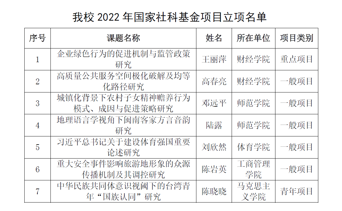近日,全国哲学社会科学工作办公室公布了2022年国家社科基金年度项目和青年项目立项公示名单,我校共获批7项,其中重点项目1项,一般项目5项、青年项目1项。立项数在去年命中6项的基础上稳中有进、再创新高,位居全国高校第195位。财经学院连续两年获批重点项目。截止目前,今年我校共获批国家级社科基金项目9项,高水平科学研究保持了良好发展态势。