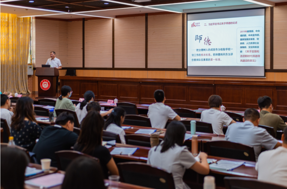 仪式后,我校“师德大讲堂”开讲。马克思主义学院肖仕平教授做了题为“学习教师职业规范  大力弘扬高尚师德”的开班第一讲。肖仕平详细阐述了习近平总书记关于师德师风建设的重要论述,并对《新时代高校教师职业行为十项准则》进行了深入而生动的解析。